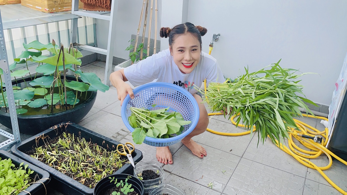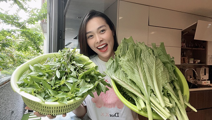 "Nếu không có vườn rau, suốt ngày tôi chỉ quanh quẩn từ phòng ngủ ra phòng ăn. Chăm vườn cây là cách tôi vận động, tránh nhàm chán. Tôi nhận ra niềm vui giản dị đôi khi chỉ là nhìn từng cây rau lớn lên", cô chia sẻ.